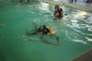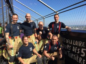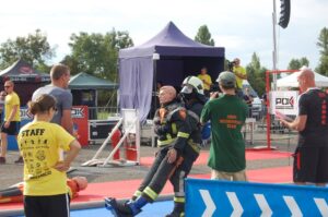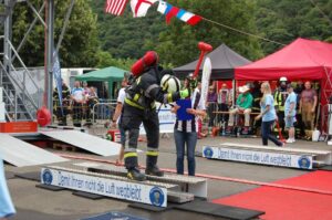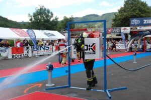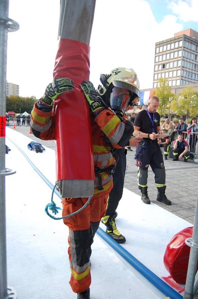 La première partie de l’épreuve consiste à porter un tuyau en écheveaux jusqu’au 3ème étage d’une tour. En haut de cette tour, un deuxième tuyau (en couronne) est hissé à la force des bras et déposé aux cotés du 1er tuyau. Cette partie se clôture en redescendant les étages, en passant par toutes les marches.