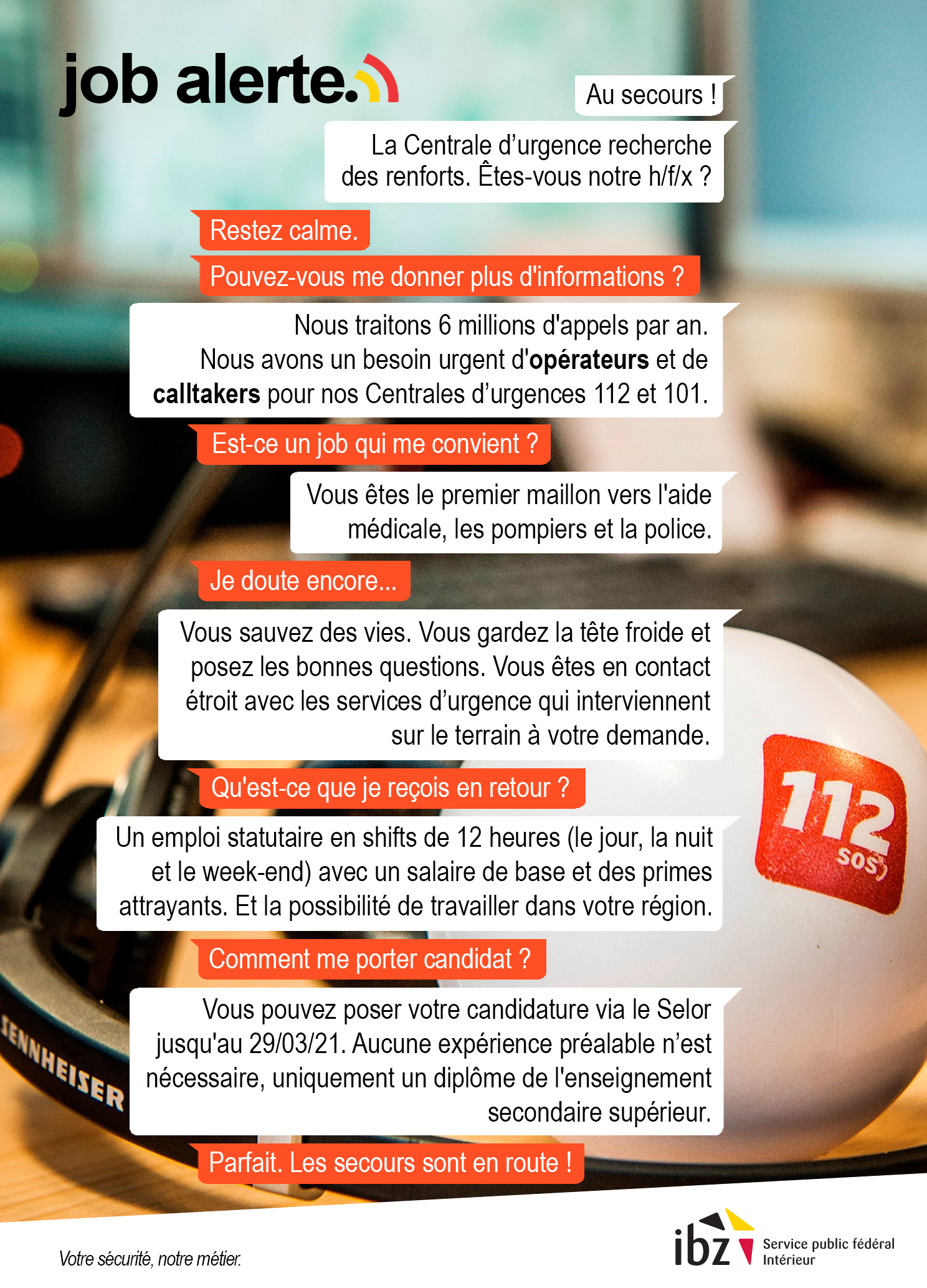 Chaque année, les Centrales d’urgence 112 et 101 traitent pas moins de 6 millions d’appels. C’est un nombre élevé, très élevé. Le Service public fédéral Intérieur est donc à la recherche de renforts et recrute 20 opérateurs et calltakers pour les centrales d’urgence du Hainaut et du Brabant wallon, ainsi que 30 opérateurs et calltakers pour les Centrales d’urgence de Namur, de Liège et du Luxembourg.  Vous pouvez postuler jusqu’au 29/03/2021.
