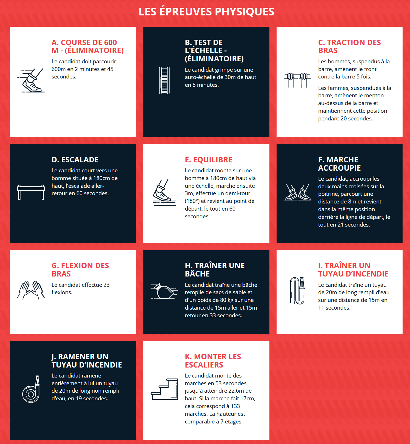3. épreuves d’aptitude physique, composées des parties suivantes : L’aptitude physique des candidats est évaluée sur la base de onze tests.